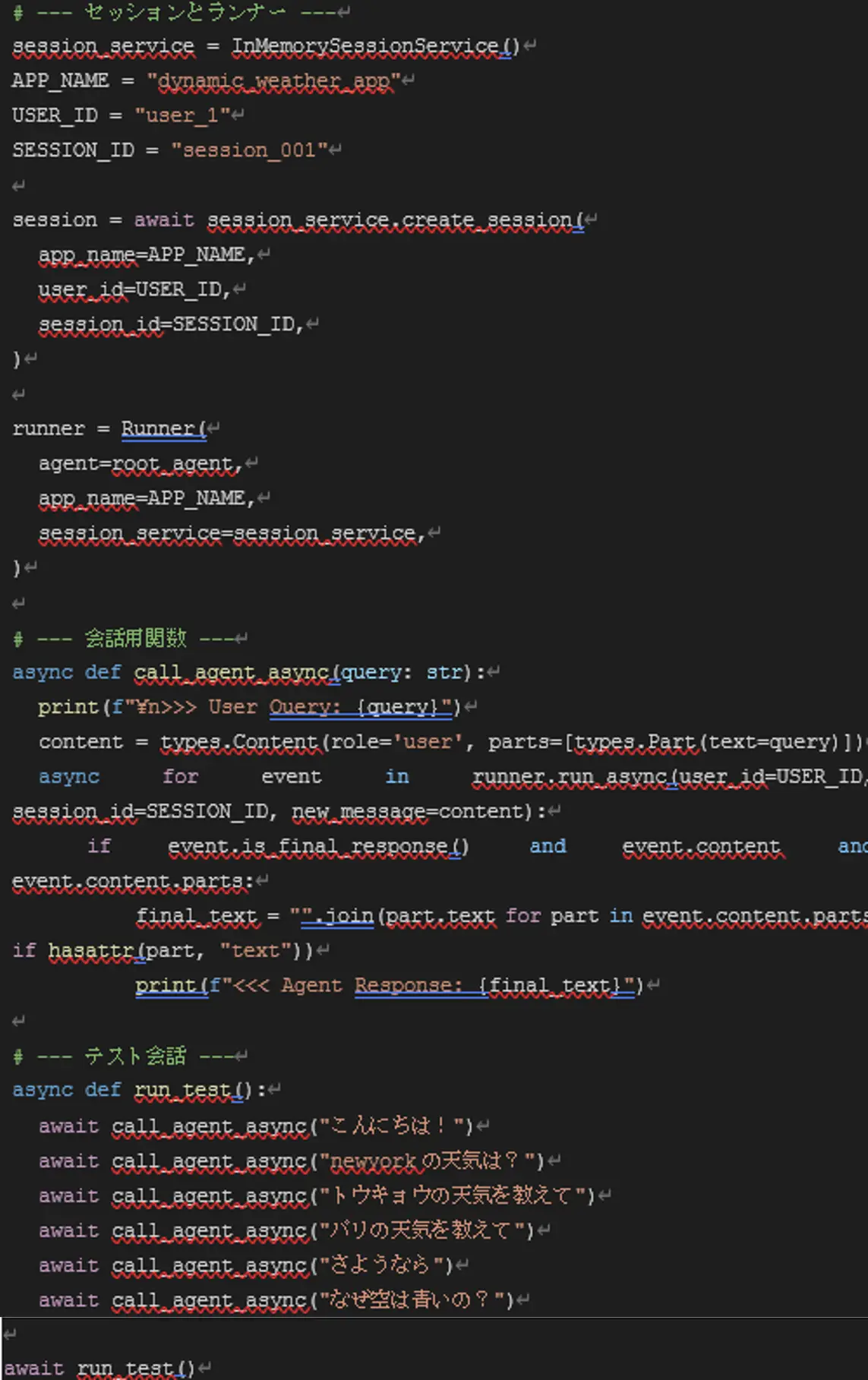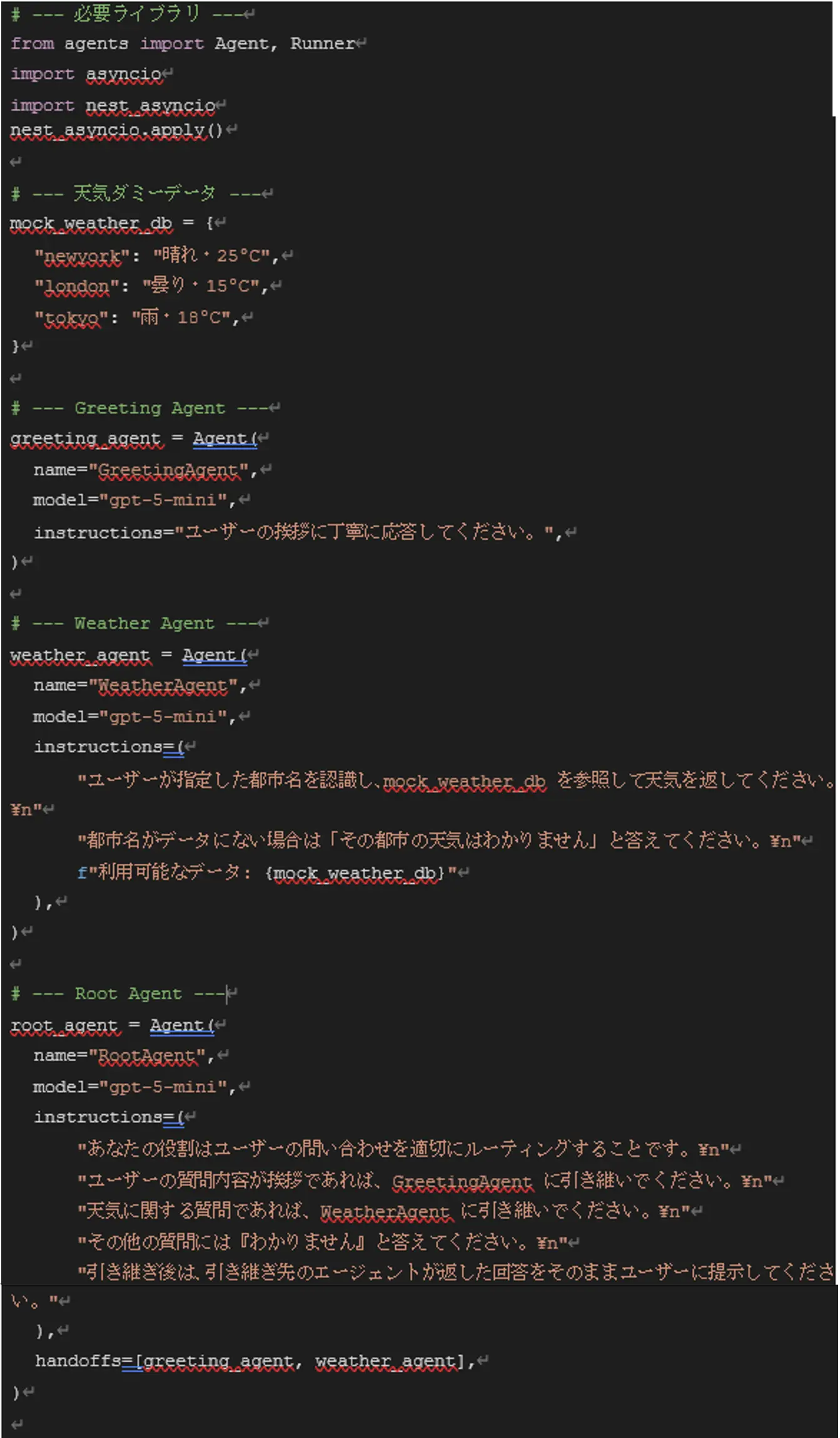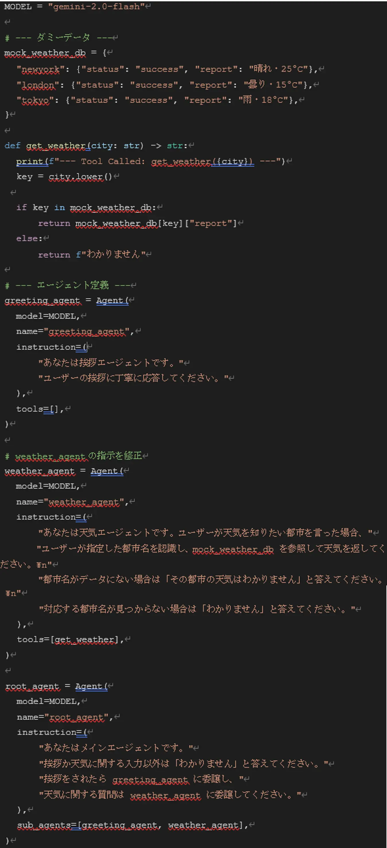 1. root_agentでユーザーの入力を受け取り、挨拶ならgreeting _agentに、天気に関する
