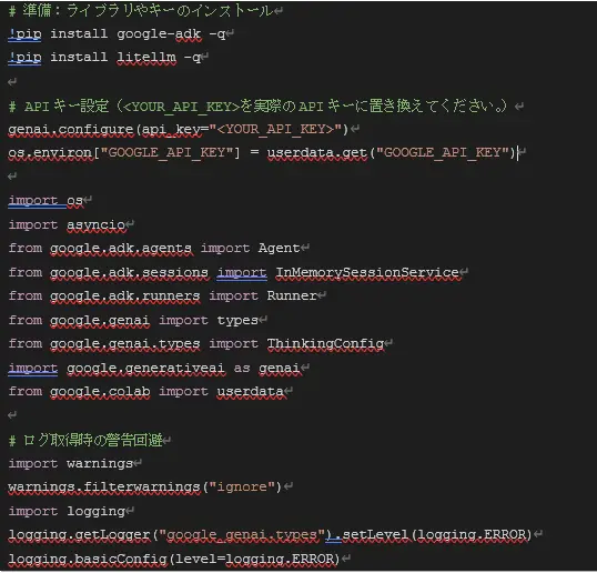 APIキーが取得できたら、まずは以下のコードをColabで実行します。