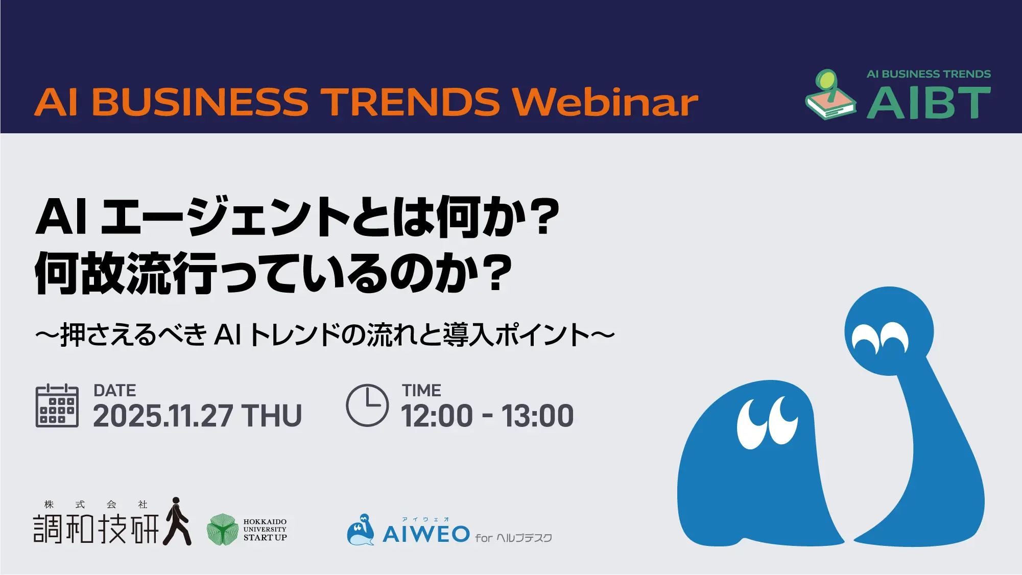 【無料オンラインセミナーのご案内】AIエージェントとは何か?何故流行っているのか?~押さえるべきAIトレンドの流れと導入ポイント〜 | 11/27(木)AI Business Trends Webinar!